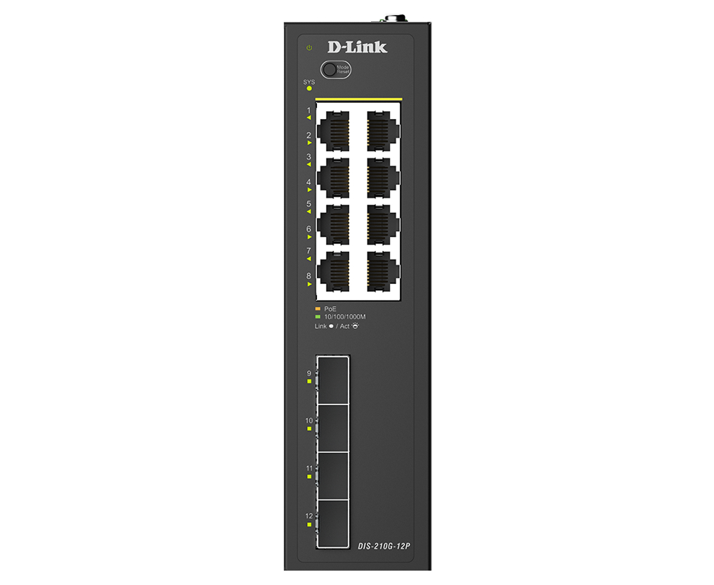 Промышленный управляемый L2 коммутатор DIS-210G-12P, оснащенный 8 портами 10/100/1000Base-T с поддержкой PoE, а также 4 портами 1000Base-X SFP, которые используются для организации подключения к высокоскоростной магистрали, предназначен для применения в сетях промышленных предприятий. DIS-210G-12P поддерживает расширенные функции управления и безопасности. Функции управления включают SNMP, управление на основе Web-интерфейса и интерфейс командной строки (CLI).
