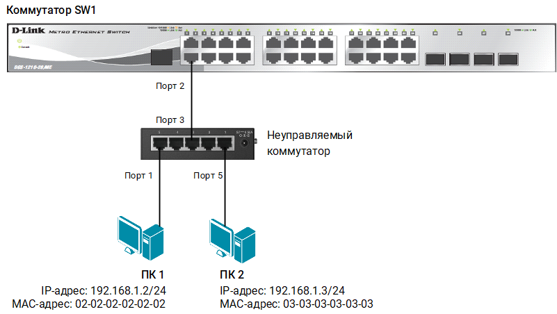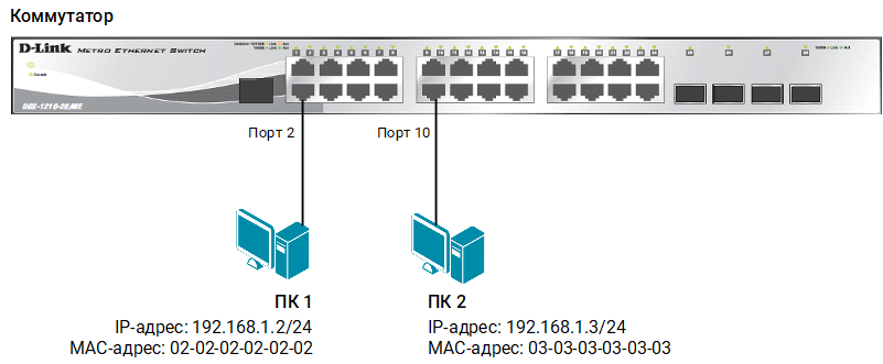Рассматриваемые примеры настройки подходят для коммутаторов с D-Link-like CLI. Замените указанные в командах МАС-адреса на реальные адреса рабочих станций, подключенных к коммутатору.