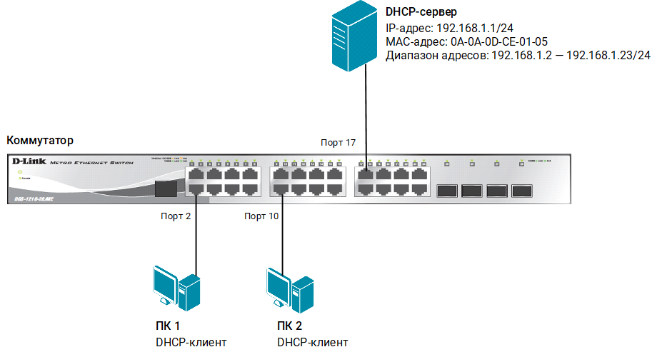 Необходимо настроить коммутатор, чтобы он динамически создавал запись IMPB после того как клиент получит IP-адрес от DHCP-сервера. Задача может быть решена настройкой функции IP-MAC-Port Binding в режиме DHCPv4 Snooping.