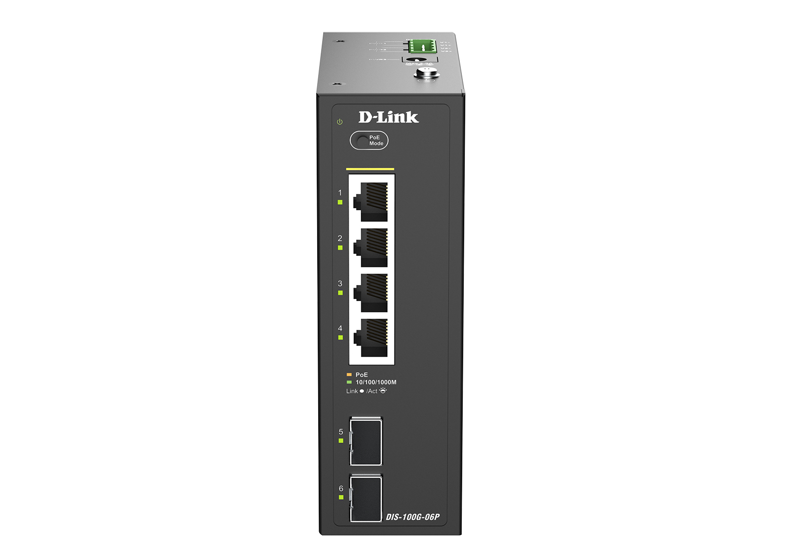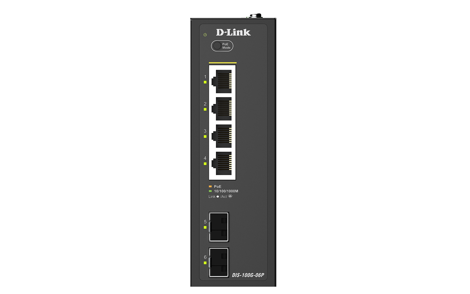 Промышленный коммутатор DIS-100G-06P оснащен 4 портами 10/100/1000Base-T с поддержкой PoE и 2 портами 1000Base-X SFP. Коммутатор предназначен для работы в расширенном температурном диапазоне от -40 до 75 °С, поддерживает резервирование питания и соответствует требованиям спецификаций по электромагнитной совместимости, скачкам напряжения и внешним воздействиям со степенью защиты корпуса IP40. Рекомендуется для применения в системах промышленной автоматизации, управления дорожным движением, на железнодорожном, морском и воздушном транспорте, в системах «Безопасный город» и на других объектах с повышенными требованиями к условиям эксплуатации. Для подключения к магистральной сети рекомендуются промышленные SFP-трансиверы D-Link c диапазоном рабочих температур от -40 до 85 °С.