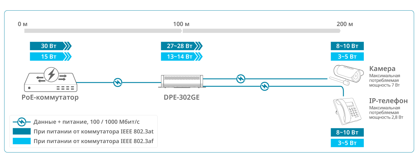 При использовании DPE-302GE в паре с PoE-сплиттером можно подключать к сети и запитывать на больших расстояниях устройства без поддержки PoE, а в паре с PoE-инжектором, например, DPE-301GI, – обеспечить питание удаленных PoE-устройств, требующих повышенной мощности.