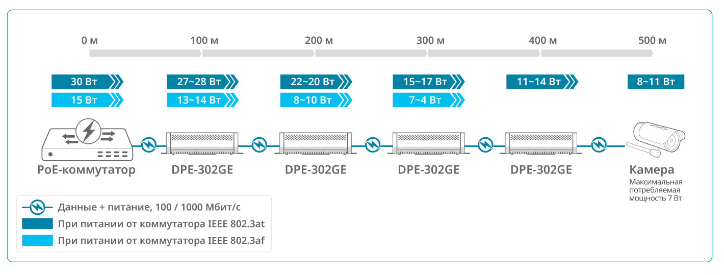 Возможность каскадного подключения до 4 PoE-повторителей позволяет увеличить дальность передачи данных и питания по PoE до 500 м1. Такое решение ускоряет монтаж и снижает стоимость внедрения нового оборудования, поскольку не требует установки дополнительных коммутаторов и подведения к ним питания в промежуточных точках.