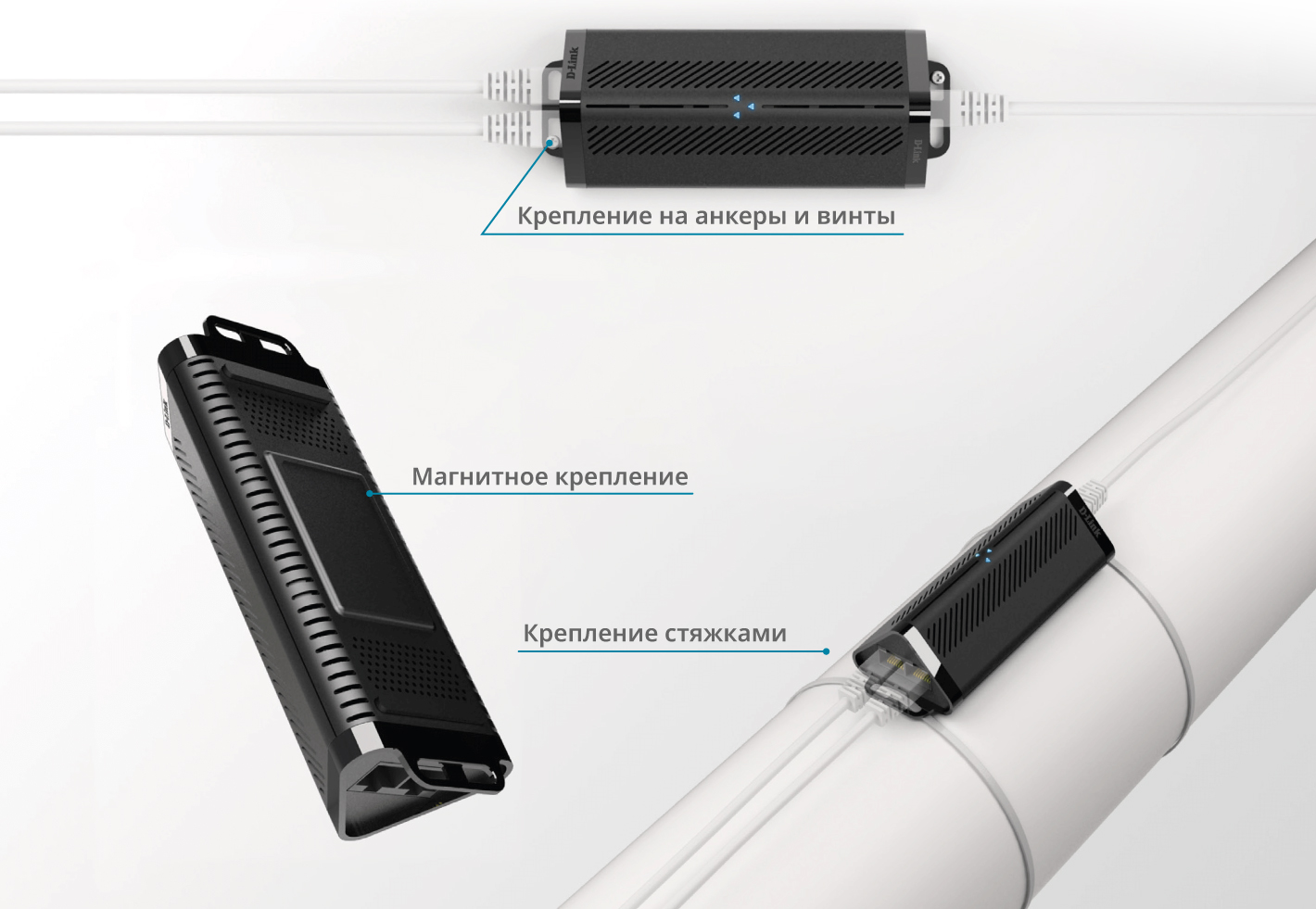 Компактный корпус, отсутствие внешнего адаптера питания и несколько вариантов крепления позволяют установить DPE-302GE в любом подходящем месте. Устройство можно закрепить на поверхности с помощью встроенного магнита, установить на стене с использованием анкеров и винтов, а также зафиксировать стяжками из комплекта поставки.
