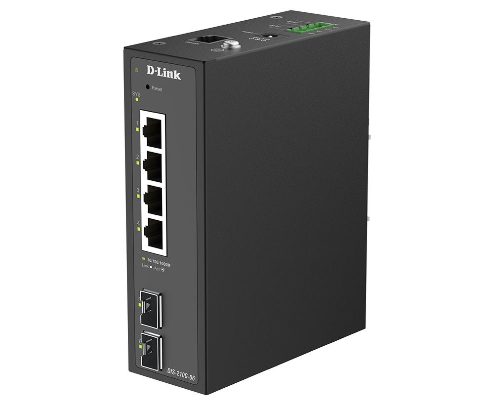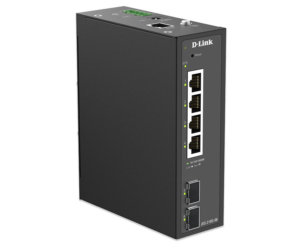 The DIS-210G-06 Layer 2 Gigabit Industrial Managed Switch is equipped with 4 10/100/1000Base-T ports and 2 SFP ports. This switch features a robust design making it ideal for deployment in industrial and outdoor cabinet surveillance settings, capable of withstanding the harshest environments. The DIS-210G-06 switch furthermore integrates advanced management and security functions to provide a complete industrial networking solution.