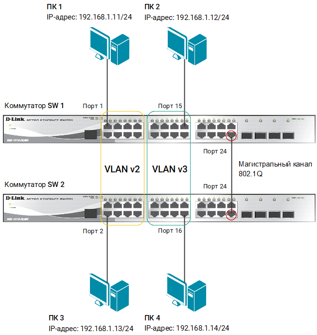 В сети организации требуется изолировать трафик сотрудников разных отделов. Задача решается при помощи функции 802.1Q VLAN. Для сотрудников каждого отдела создается отдельная виртуальная сеть (VLAN). Сотрудники первого отдела находятся в VLAN v2, сотрудники второго отдела — в VLAN v3. Передача трафика каждой VLAN между коммутаторами сети выполняется через магистральный канал.