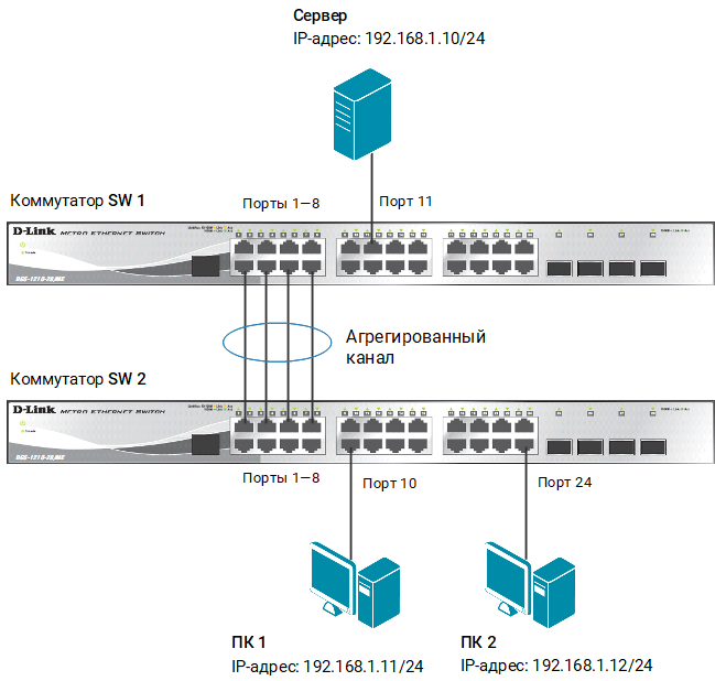 Программное обеспечение коммутаторов D-Link поддерживает два типа агрегирования каналов связи: статическое и динамическое, на основе стандарта IEEE 802.3ad (LACP).