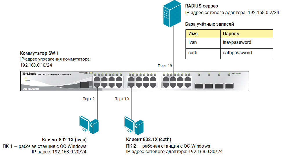 В локальной сети необходимо обеспечить аутентификацию пользователей при подключении их к сети. Задача решается настройкой Port-Based 802.1X на портах коммутатора. Кроме коммутатора, необходимо настроить RADIUS-сервер и 802.1X-клиент на рабочей станции. В качестве RADIUS-сервера можно использовать пакет freeradius для OC Linux.