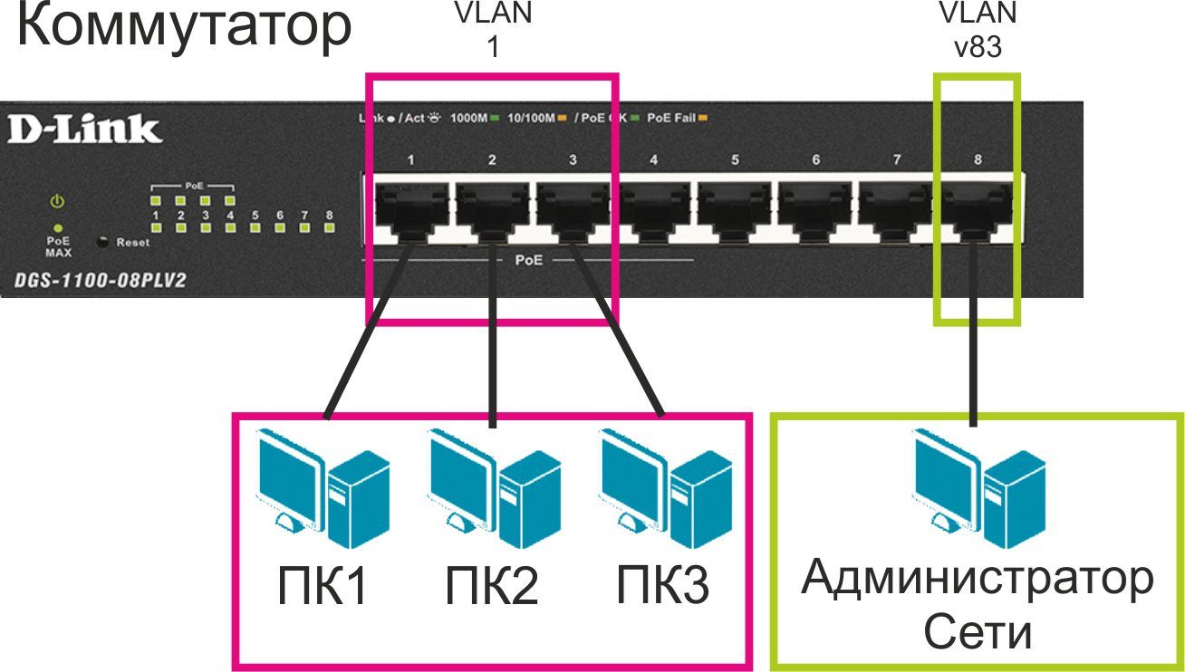 Для повышения безопасности сети требуется создать отдельную VLAN, которую настроить в качестве Management VLAN. Для VLAN управления рекомендуется использовать редко встречающийся идентификатор, например 83. Порт, к которому подключено рабочее место администратора, сделать членом этой VLAN.