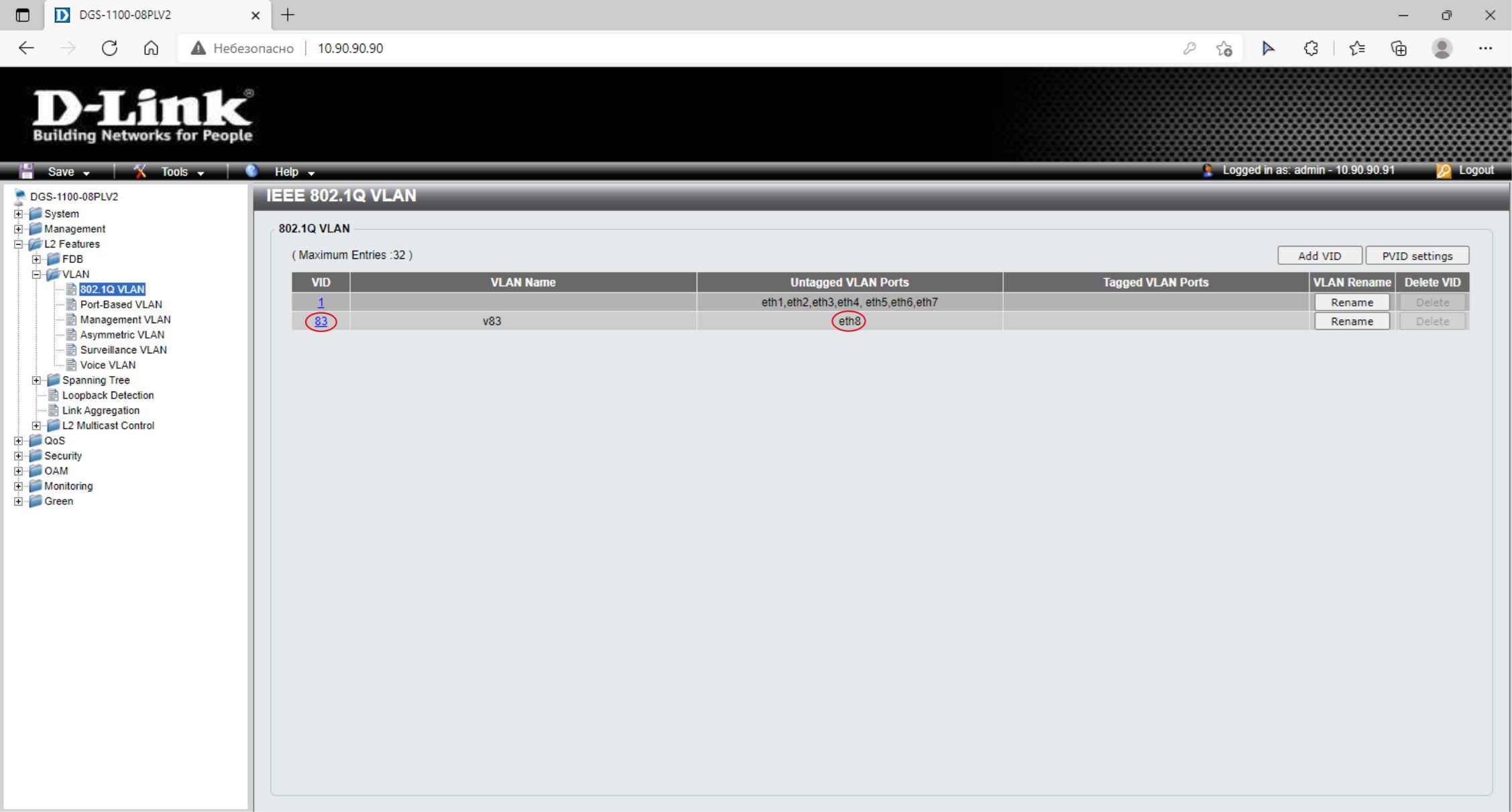 3. Создайте VLAN v83, которая будет использоваться для управления коммутатором (порядок настройки VLAN 802.1Q можно узнать здесь). Добавьте порт 8 как немаркированный (untagged) в VLAN v83. Проверьте созданные VLAN.