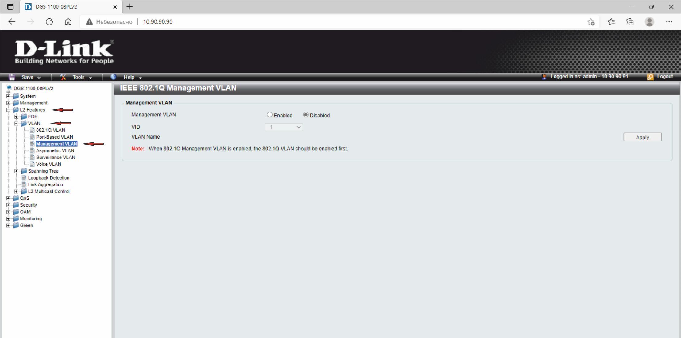 4. Назначьте управляющую VLAN (Management VLAN). Для этого в меню слева выберите L2 Features –> VLAN –> Management VLAN. Активируйте функцию, нажав радиокнопку Enabled. Выберите в выпадающем списке VID значение 83. В поле VLAN Name отобразится имя VLAN v83. Нажмите Apply.