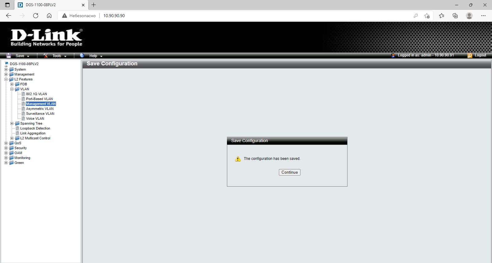 6. Проверьте возможность подключения к Web-интерфейсу коммутаторов с любого компьютера из любой VLAN. При правильных настройках управление возможно только с рабочего места администратора, находящегося в VLAN v83.