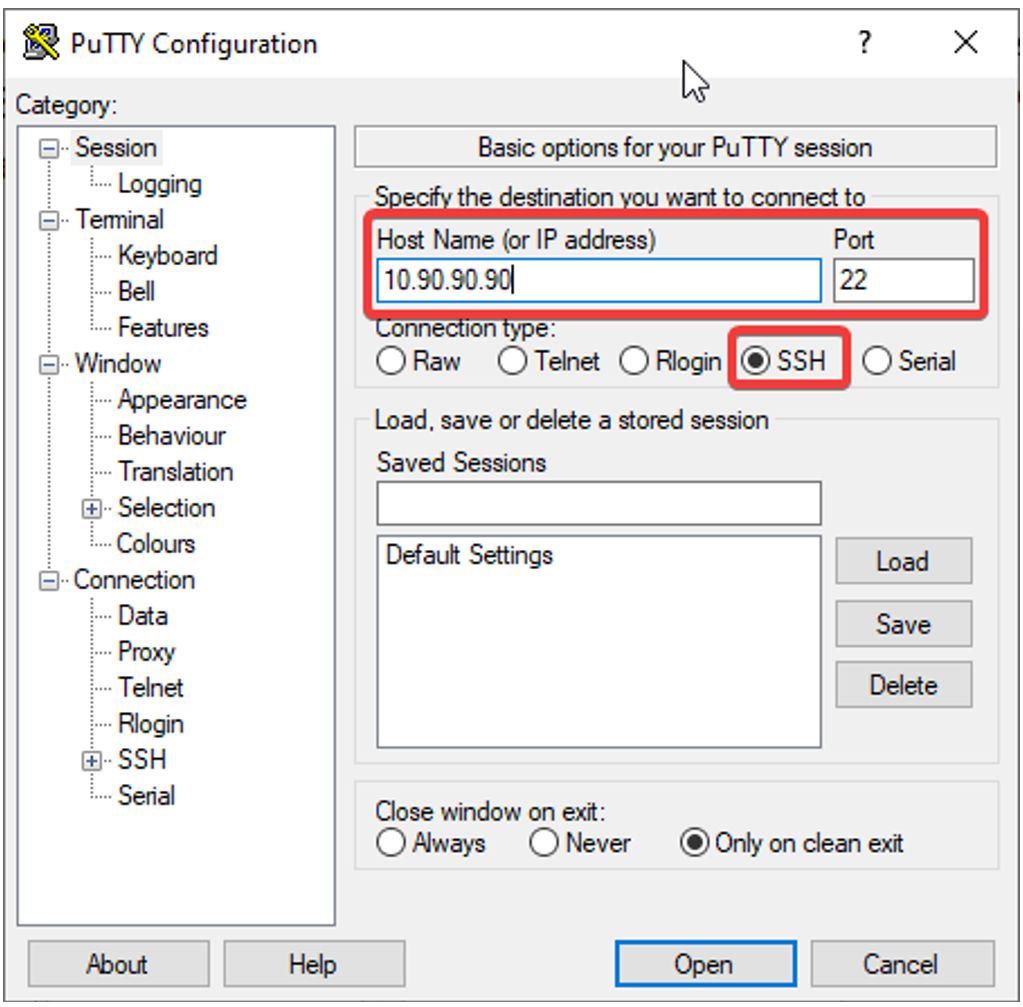 - На экране появится панель входа приложения Putty. В строке Connection type выберите SSH, в строке Host Name (or IP address) введите 90.90.90, в поле Port —22. Нажмите кнопку Open.