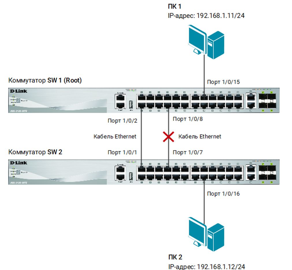 Для обеспечения отказоустойчивости коммутаторы соединены друг с другом двумя кабелями. Чтобы избежать возникновения петель в сети на коммутаторах настраивается протокол связующего дерева RSTP.