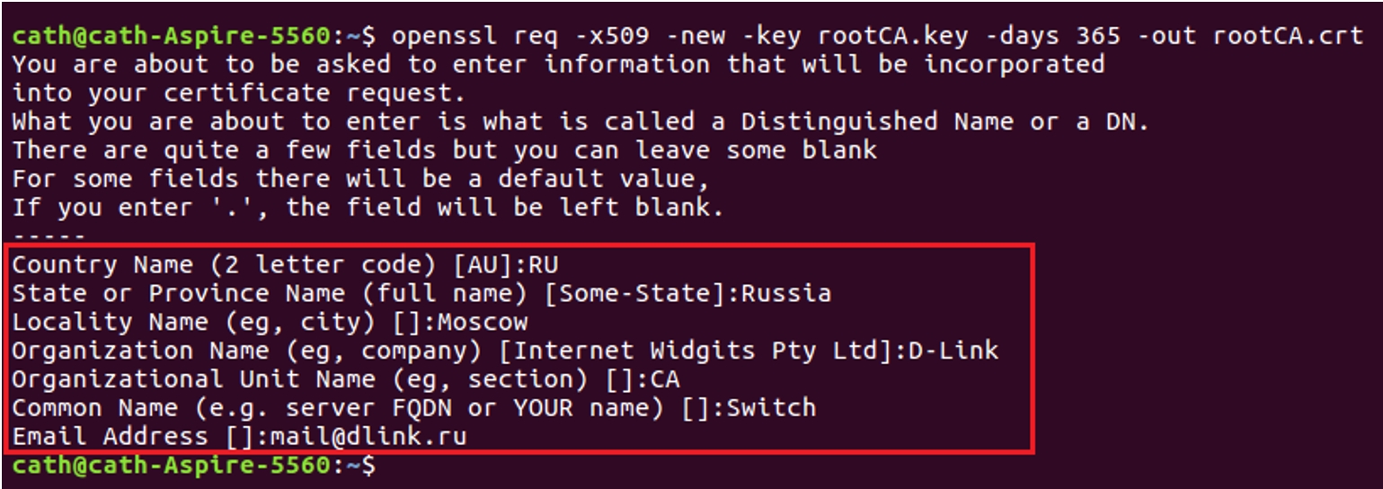 Закрытым ключом rootCA.key в дальнейшем будет подписан пользовательский сертификат, который нужно загрузить на коммутатор.