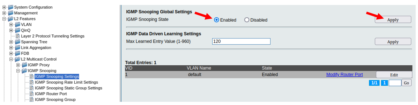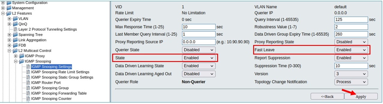 В открывшемся окне выберите Enabled в полях State и Fast Leave. Остальные параметры можно оставить по умолчанию. Нажмите Apply.