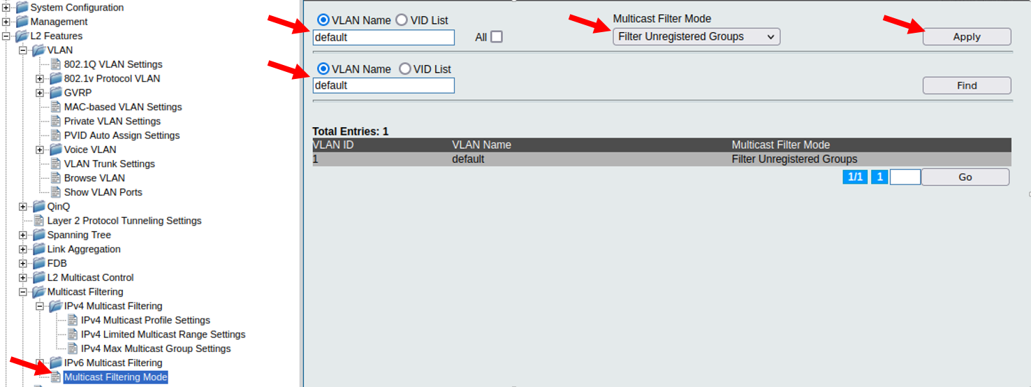 Введите имя VLAN, в которой необходимо включить фильтрацию, в поля VLAN name (в примере – default). В списке Multicast Filter Mode выберите Filter Unregistered Groups и нажмите Apply.