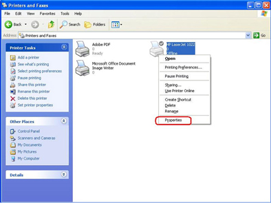 В операционной системе откройте "Printers and Faxes" . На установленном принтере кликните правой кнопкой мышки, и выберите из появившегося меню "Properties".