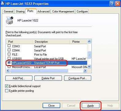 В настройках портов принтера поставьте галочку напротив вновь созданного TCP/IP порта. А затем сохраните настройки.