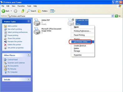 Далее, кликнув правой кнопкой мыши на принтере, выберите из появившегося меню - "Use Printer Online".
