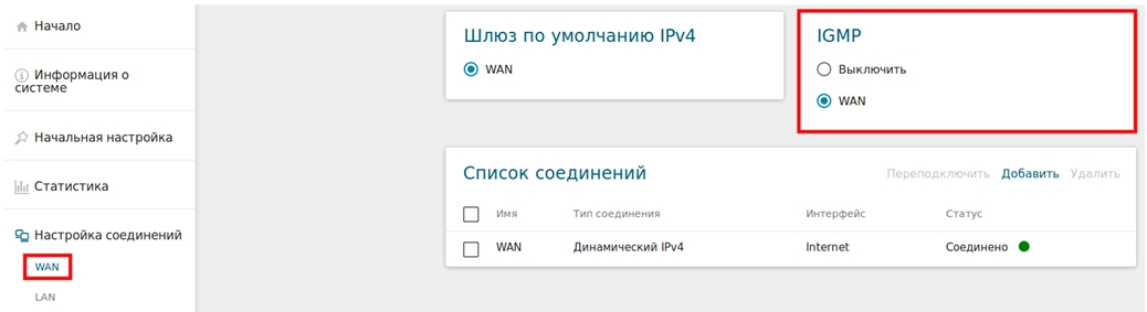 2. Убедитесь, что IGMP включено для соединения, через которое вы получаете доступ в Интернет. В данном случае это соединение с именем WAN.