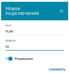 3. Далее нажмите на значок "+", чтобы создать Новое подключение. В открывшемся окне введите Имя (оно задается произвольно) и VLAN ID, который выдал вам интернет-провайдер. Нажмите кнопку Сохранить.
