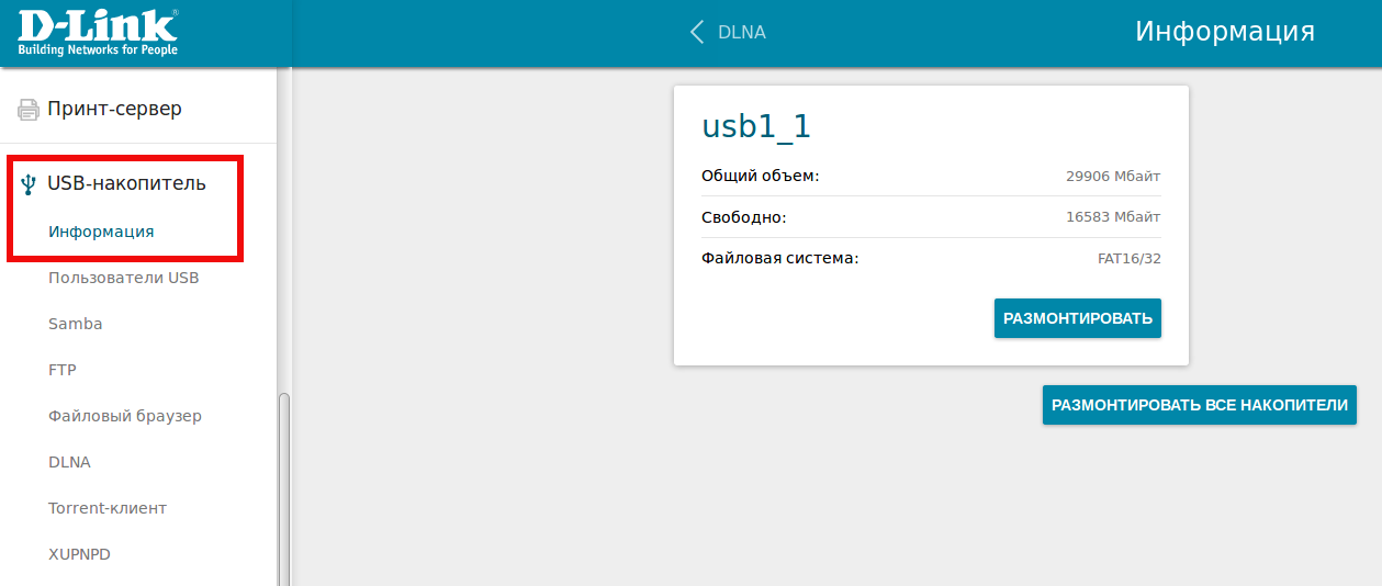2. В меню слева выберите раздел USB-накопитель / Информация и на открывшейся странице убедитесь, что USB-накопитель, подключенный к USB-порту маршрутизатора, определился в системе.