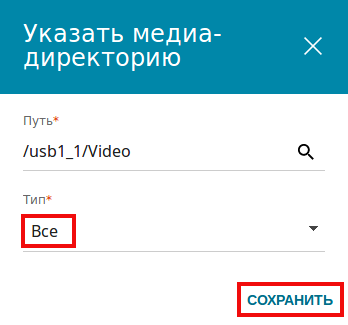 8. Укажите соответствующий тип данных из списка: Все, Аудио, Видео или Изображение. В данном примере выбран тип Все. Нажмите кнопку Сохранить.