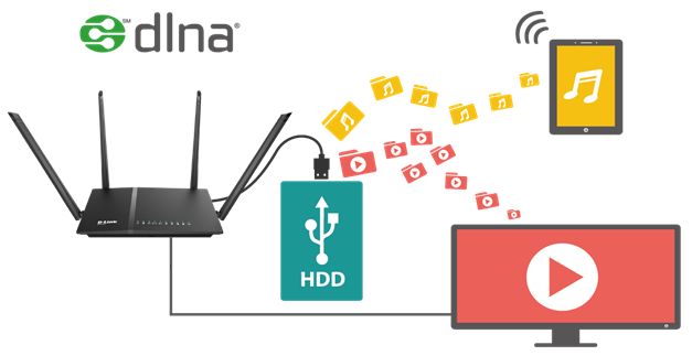 Встроенный медиасервер DLNA позволяет транслировать медиаконтент с подключенного к маршрутизатору USB-накопителя на любые проводные и беспроводные устройства с поддержкой DLNA. Воспроизведение медиаконтента возможно, только если USB-накопитель подключен к маршрутизатору.