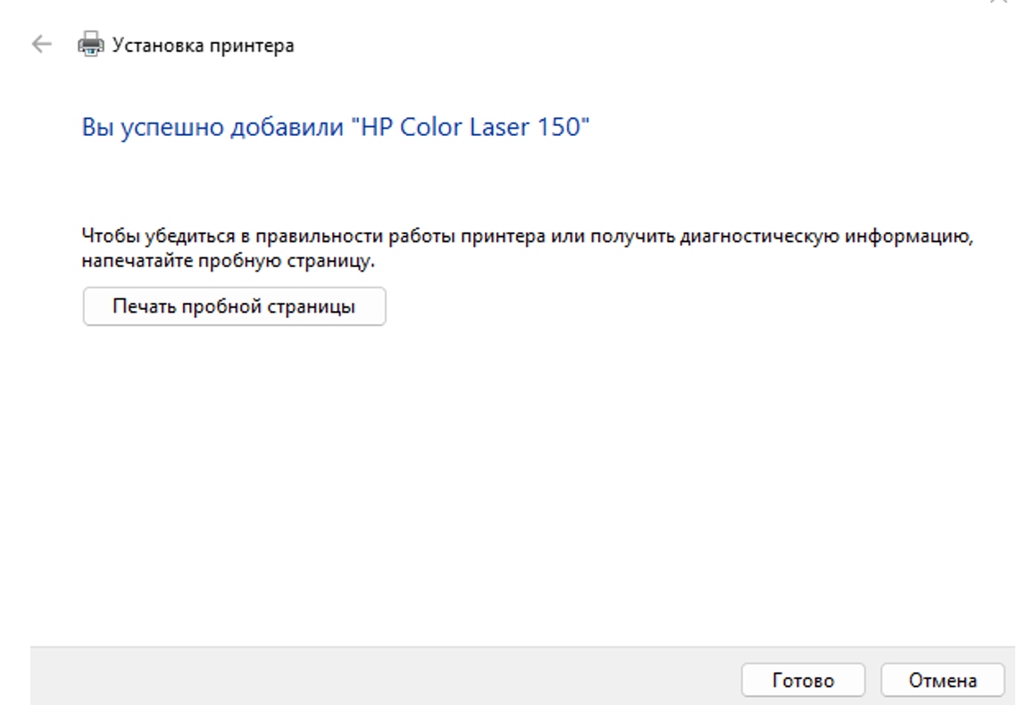 - При необходимости распечатайте пробную страницу. Для завершения установки нажмите Готово.