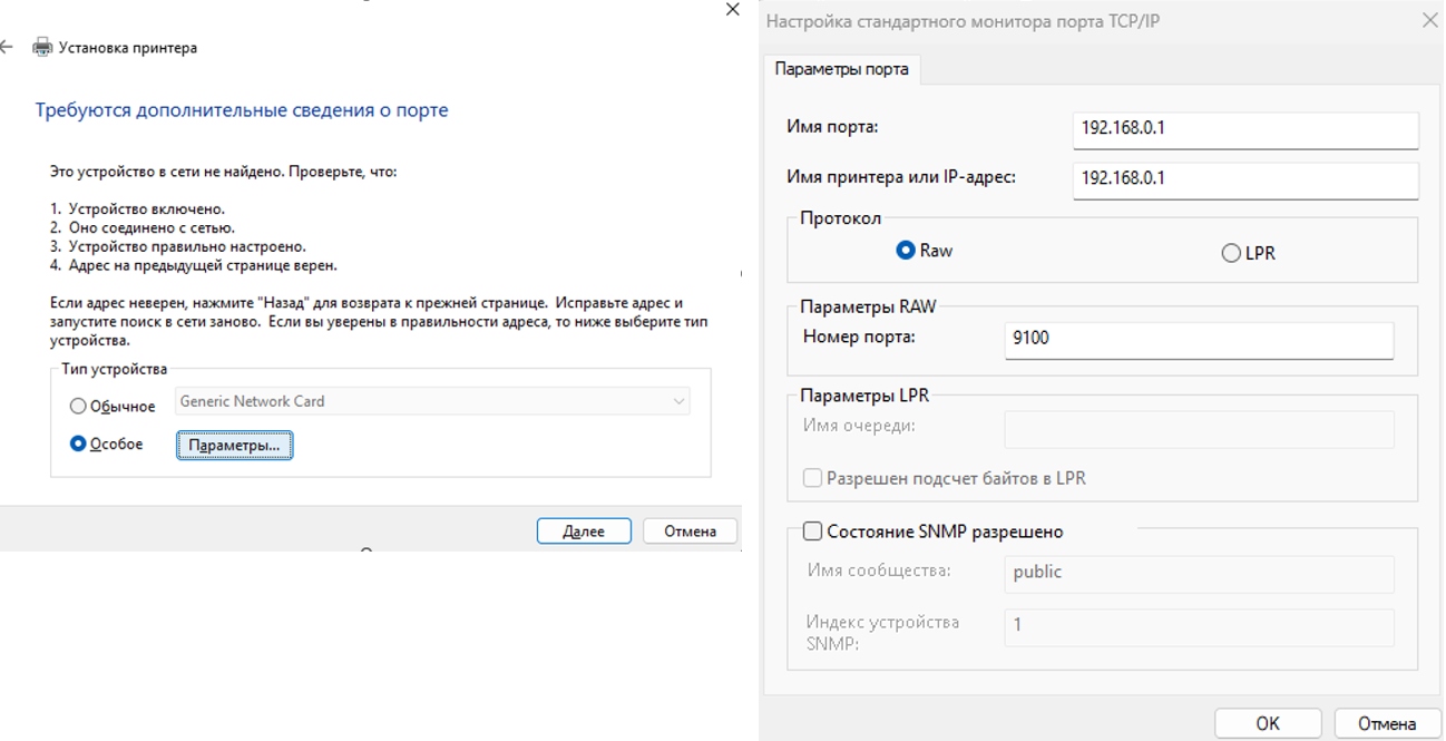- Подождите 20-30 секунд. В открывшемся окне Требуются дополнительные сведения о порте выберите значение Особое и нажмите Параметры. Убедитесь, что выбрано значение протокола Raw и указан номер порта 9100. Нажмите OK, затем Далее.
