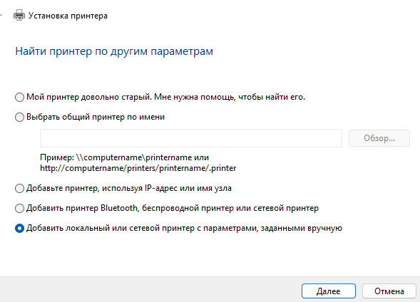 - Выберите Принтеры и сканеры → Добавить принтер или сканер → Добавить новое устройство → Добавить локальный или сетевой принтер с параметрами, заданными вручную. И нажмите Далее.