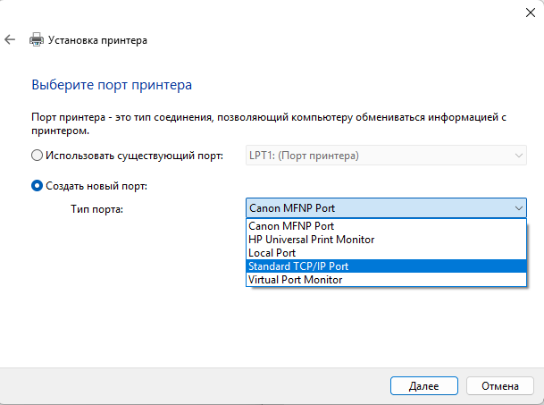 - Выберите значение Создать новый порт и в раскрывающемся списке выберите Standard TCP/IP Port. Нажмите Далее.