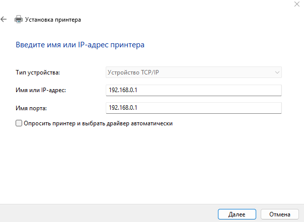 - В поле Имя или IP-адрес укажите IP-адрес маршрутизатора (по умолчанию – 192.168.0.1). Снимите флажок Опросить принтер и выбрать драйвер автоматически и, если необходимо, измените наименование порта в поле Имя порта. Нажмите Далее.