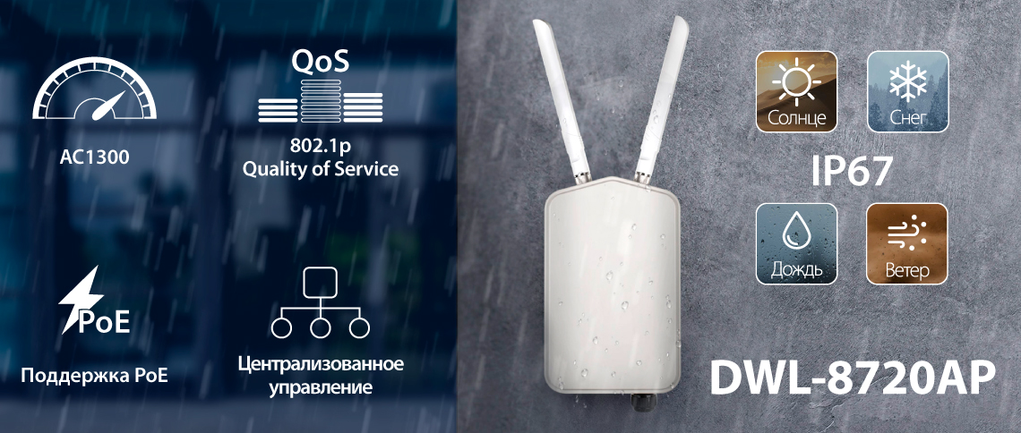 Москва, Россия, 4 января 2021 года. Компания D-Link представляет внешнюю унифицированную точку доступа AC1300 Wave 2 DWL-8720AP со степенью защиты IP67. Новинка предназначена для построения распределенных беспроводных сетей корпоративного уровня с высокой плотностью мобильных клиентов средних и крупных промышленных предприятий, учебных заведений, медицинских центров, гостиничных комплексов. Корпус DWL-8720AP обеспечивает защиту устройства от проникновения пыли и мелких частиц, водяных струй, а также при полном погружении в воду на время до 30 минут. Рабочий температурный диапазон от -40 до +60ºС.