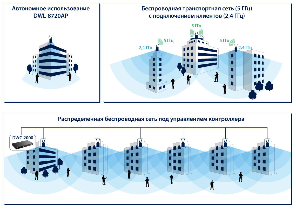 - в составе группы устройств под управлением беспроводного контроллера, например, DWC-1000 и DWC-2000, для создания распределенных, масштабируемых беспроводных сетей с централизованным управлением, бесшовным роумингом и балансировкой нагрузки между соседними устройствами. Поддержка стандарта IEEE 802.11k Radio Resource Measurement ускоряет процесс переключения беспроводных клиентов между соседними точками доступа.