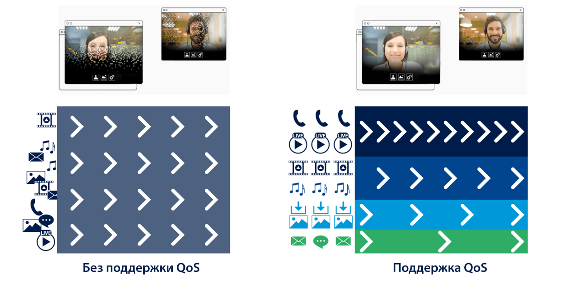 Поддержка стандарта 802.1p (CoS) и технологии WMM (Wi-Fi Multimedia) обеспечивает приоритетную передачу чувствительного к временным задержкам трафика, например, потокового видео, IP-телефонии и др. при высокой загруженности беспроводной сети.