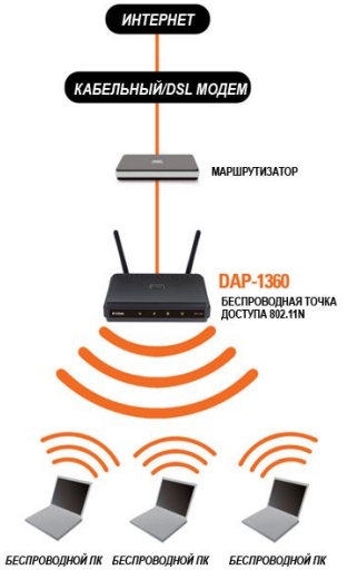 2. Разместить в нужных местах точки доступа в режимах репитера и/или клиента. В режиме репитера точка доступа принимает сигнал по Wi-Fi и сама вещает эту же сеть, увеличивая таким образом радиус ее действия. На сегодняшний день этот режим поддерживает только точка доступа DAP-1360/D1.