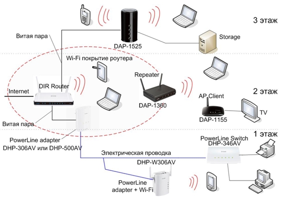 Этот вариант сочетает в себе преимущества двух первых, и в то же время лишен их недостатков. Таким образом, PowerLine – практически идеальное решение, чтобы организовать Wi-Fi сеть в удаленных от маршрутизатора помещениях и на других этажах.