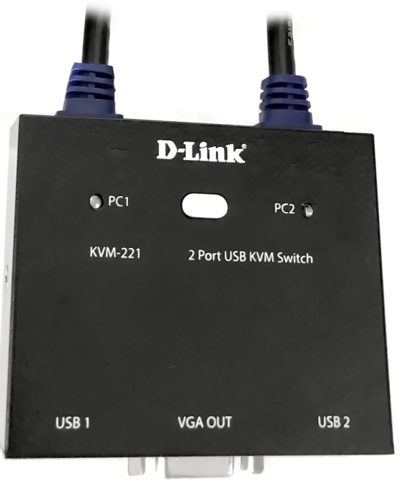 KVM-221 выполнен в компактном металлическом корпусе с 2 встроенными VGA-кабелями длиной 1,4 м для подключения ПК. Устройство оснащено VGA-портом для монитора с разрешением до 2048 x 1536 и 2 USB-портами для клавиатуры и мыши. Выбор компьютера осуществляется кнопкой на верхней панели устройства, горячими клавишами или внешней кнопкой переключения, входящей в комплект поставки. Устройство получает питание от ПК через порт USB.