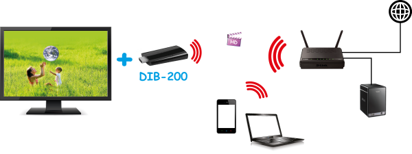 Tänapäeval on teler üha enam muutumas meediasisu kuvamise kohaks. Siiski ei ole kõik telerid varustatud vajalike liidestega. Ühendades teleri HDMI-sisendisse DIB-200, saate traadita võrku ühendatud seadmetelt vaadata pilte suure detailsusega, HD-kvaliteedis muusikavideoid internetist, võrgukettalt või mobiiliseadmelt (iOS 5+ ja Android 4+). DIB-200 toetab formaate JPEG, MP3, WMA, H.264, MPEG¤ ja WMV.