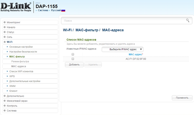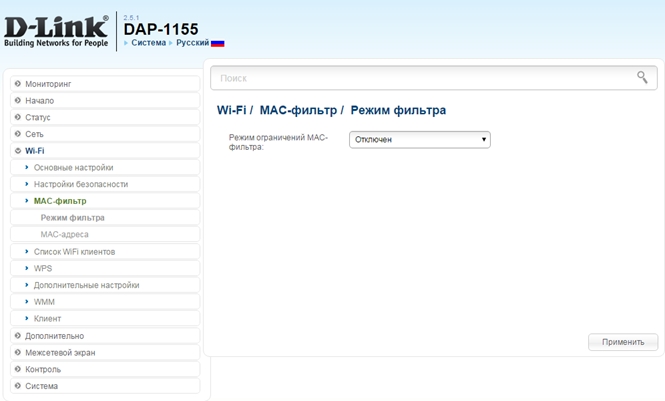 Ниже будут рассмотрены режимы МАС-фильтра и их настройка на примере DAP-1155 rev. B1.