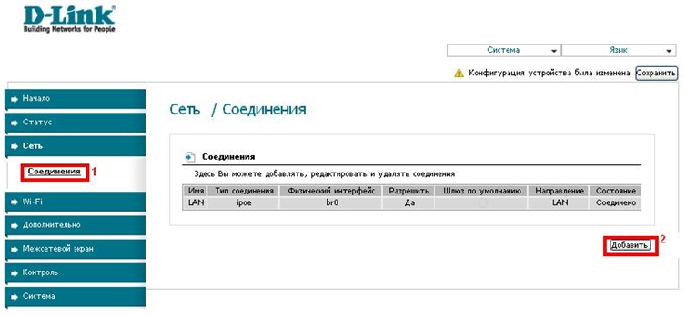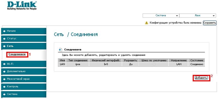 В меню, расположенном слева, на вкладке «Сеть» откройте раздел «Соединения». И нажмите кнопку «Добавить».