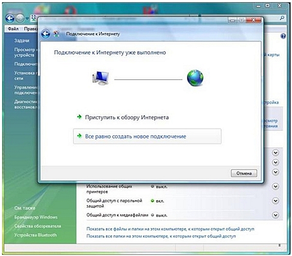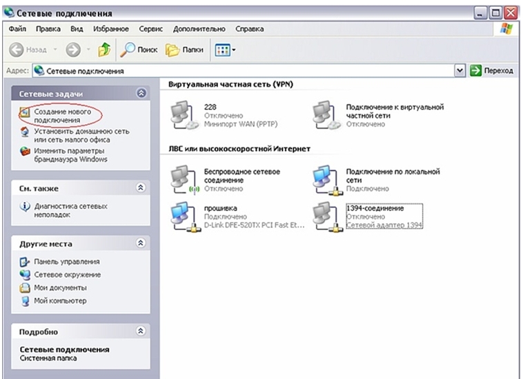 1.Откройте«Панель управления», затем «Сетевые подключения» и выберите пункт «Создание нового подключения»