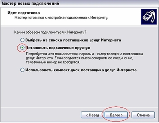 4.Выберите пункт«Установить подключение вручную» и нажмите «Далее»
