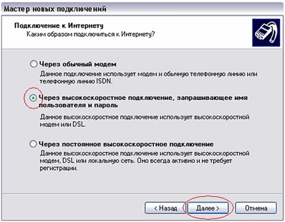 5.Выберите пункт «Через высокоскоростное подключение, запрашивающее имя пользователя и пароль» и нажмите «Далее»