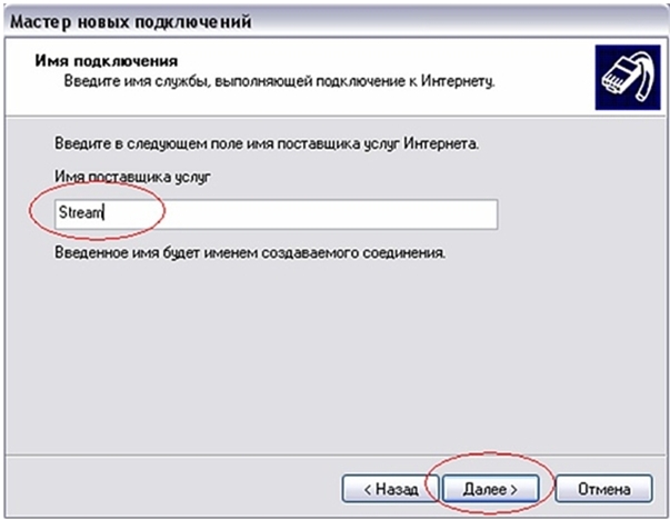 6.В строке «Имя поставщика услуг» наберите ЛЮБОЕ имя (например Stream). Так будет называться созданное подключение. Нажмите «Далее»