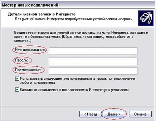 7.В строках «Имя пользователя» и «Пароль» наберите логин и пароль, предоставленные провайдером. В строке «Подтверждение» повторно наберите пароль. Нажмите «Далее».