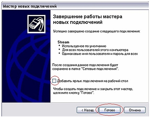 8.По желанию можно добавить ярлык подключения на рабочий стол. Для завершения работы мастера новых подключений нажмите «Готово»