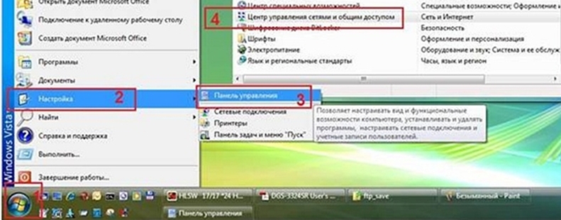 1. Нажмите Пуск [1] -> Настройки [2] -> Панель управления [3] -> Центр управления сетями и общим доступом [4] (Рисунок 1)