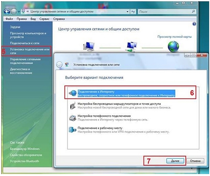 2. Нажмите Установка подключения или сети [5] -> Подключение к Интернет [6] -> Далее [7] (Рисунок 2)